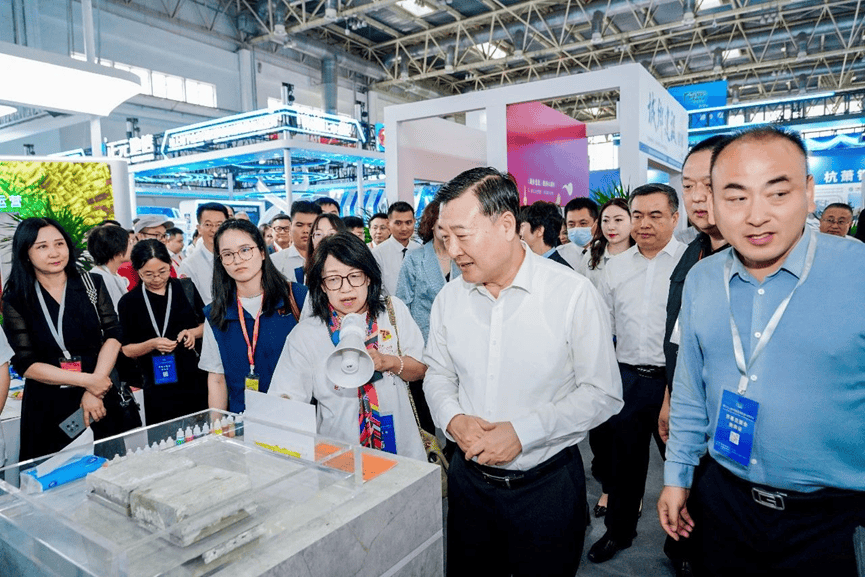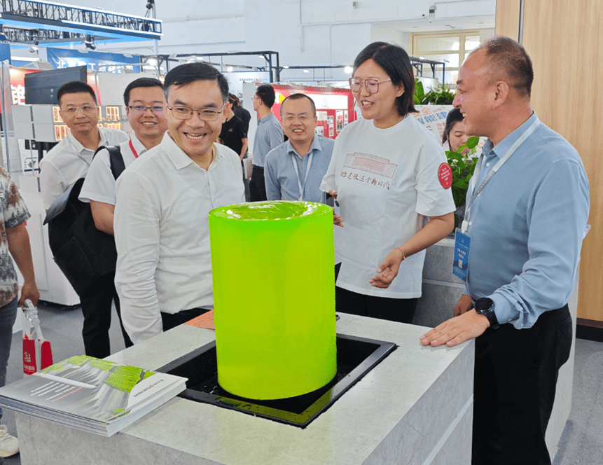 姜萬(wàn)榮副部長(zhǎng)參觀澎內(nèi)傳展臺(tái),邊聽(tīng)講解、邊認(rèn)真觀看水池池壁裂縫自愈合實(shí)際應(yīng)用效果。